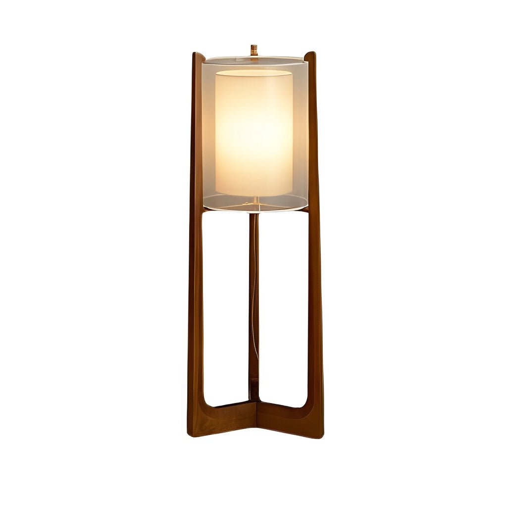 - Natural finish wood forms a Japanese-style triangle stand to this rustic farmhouse LED floor lamp with double shades.